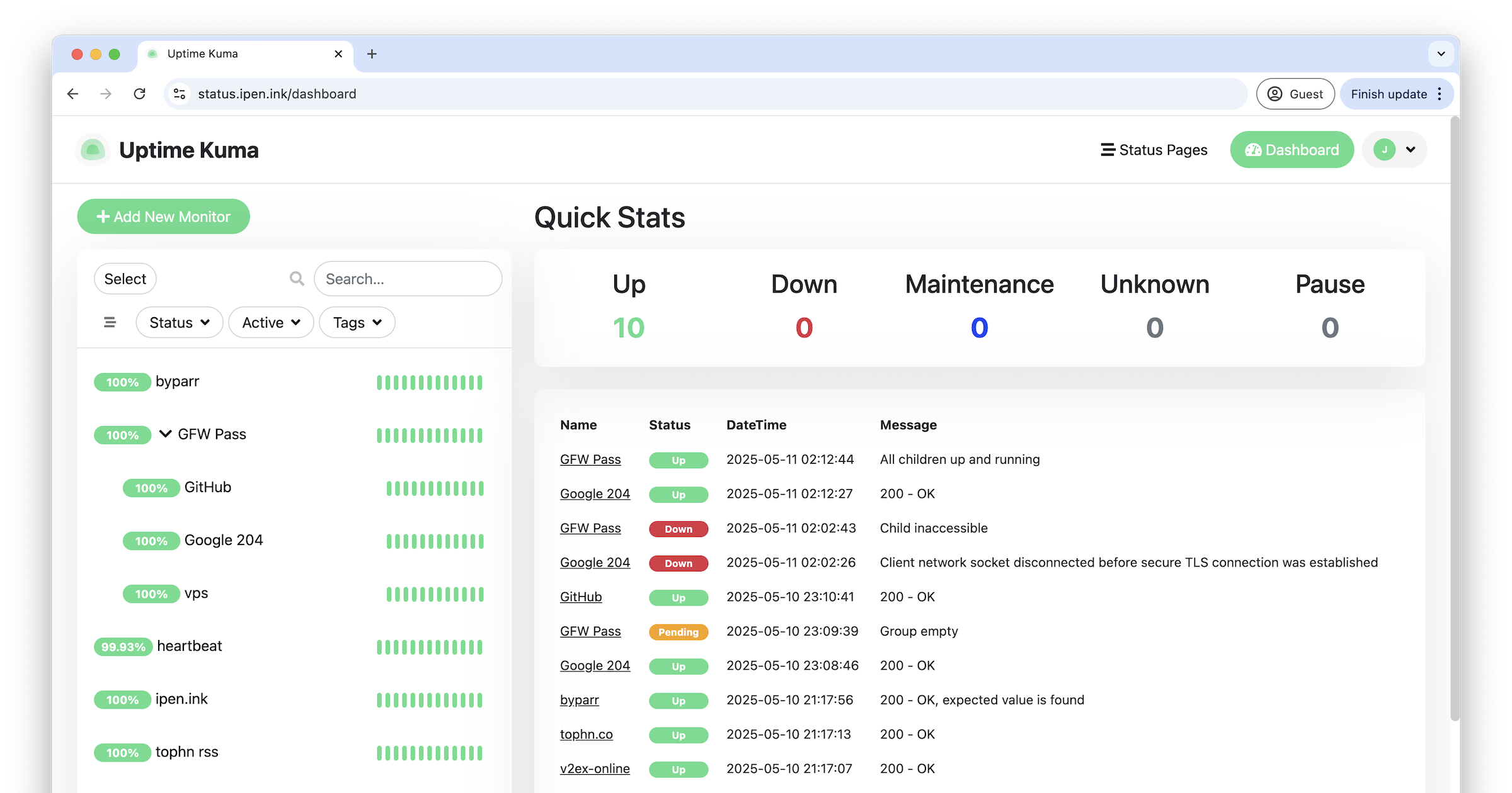 如果是部署在内网,可以搞个内网穿透,uptime-kuma 原生支持 Cloudflare Tunnel, 按照教程配置一下,即使不在家也能随时随地查看服务状态。